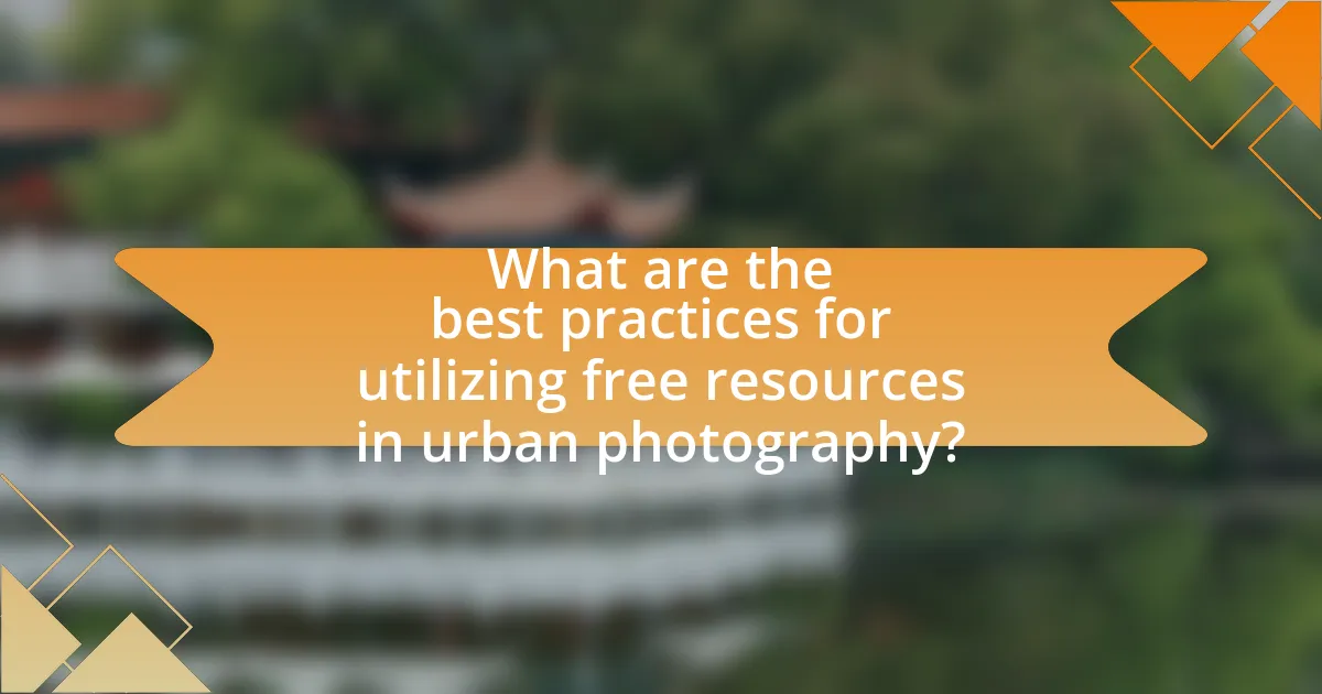 The best practices for utilizing free resources in urban photography include leveraging public spaces, utilizing online platforms for inspiration and education, and engaging with local communities. Public spaces such as parks, streets, and markets provide diverse subjects and settings for photography without any cost. Online platforms like Flickr, Unsplash, and social media groups offer a wealth of inspiration, tutorials, and feedback from fellow photographers, enhancing skills and creativity. Engaging with local communities can lead to collaborative projects and access to unique locations, enriching the urban photography experience. These practices are validated by the increasing number of photographers who successfully use free resources to build portfolios and gain recognition in the field.