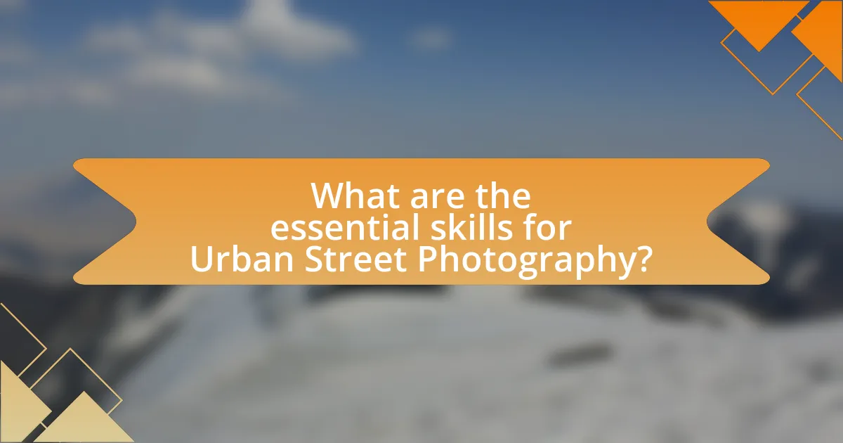 The essential skills for Urban Street Photography include keen observational skills, technical proficiency in camera settings, and the ability to capture candid moments. Observational skills allow photographers to notice unique interactions and details in urban environments, which are crucial for storytelling through images. Technical proficiency ensures that photographers can effectively manipulate exposure, focus, and composition to create visually compelling photographs. The ability to capture candid moments is vital, as street photography often relies on spontaneity and authenticity, making it important for photographers to anticipate and react quickly to unfolding scenes.